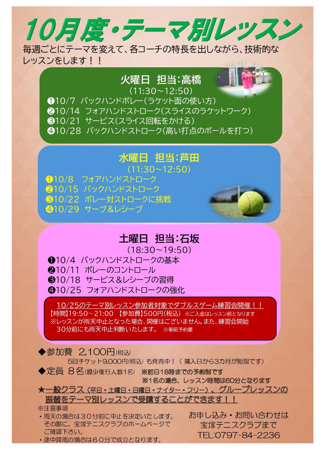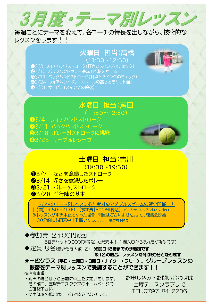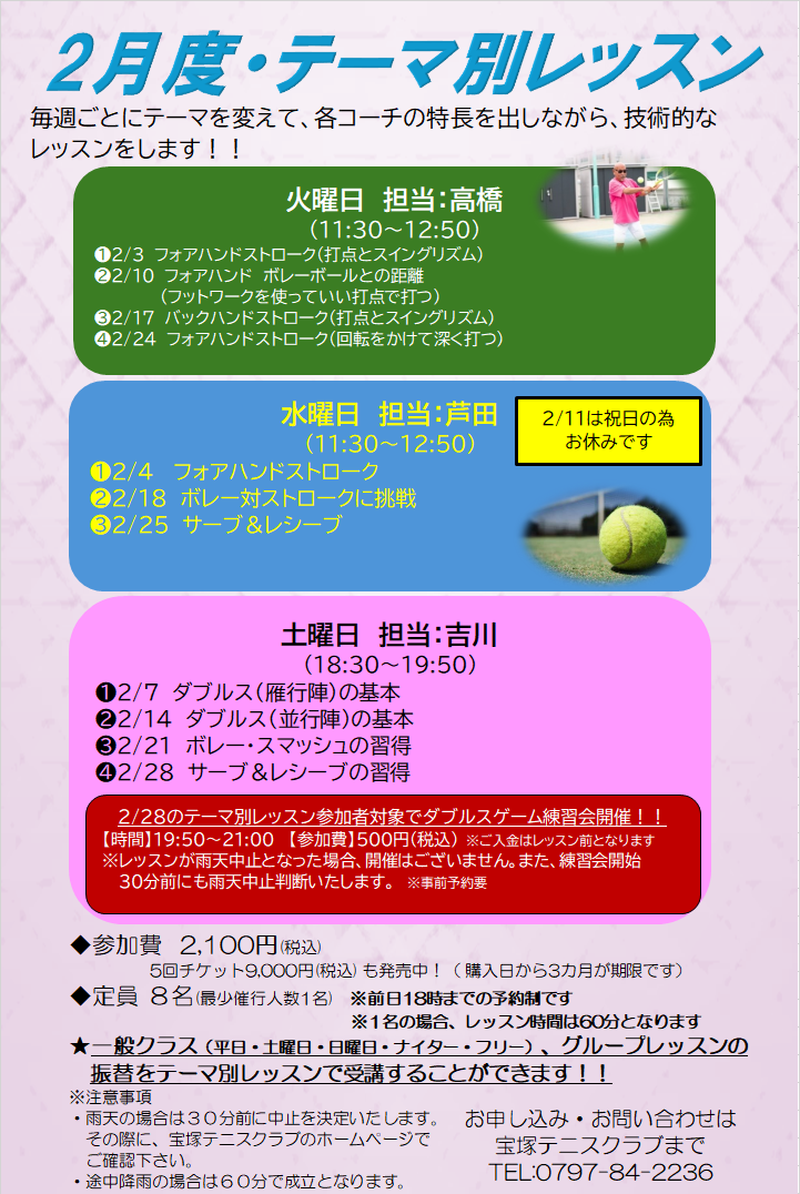 宝塚テニスクラブでは、レベル別に応じたクラス編成のほかに、プライベートレッスンやグループレッスンも開講しています。初心者の方からもっと上達したい方まで、すべての方にテニスを楽しんでいただけるよう運営しています。